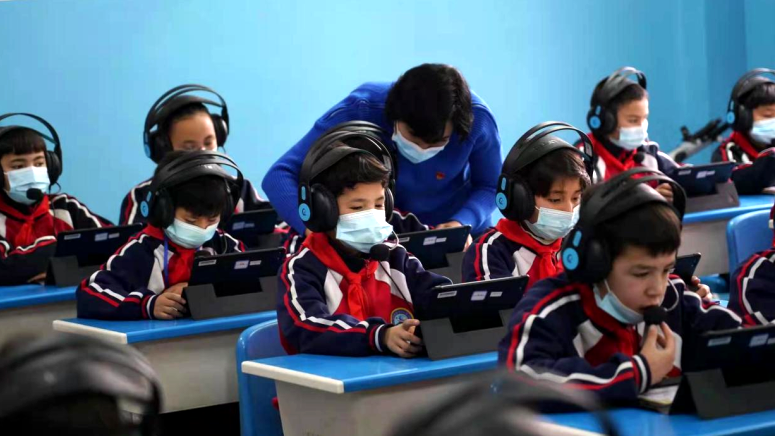 “請(qǐng)同學(xué)們大聲朗讀課文中的生字詞……好的,接下來開始描紅練習(xí)。”努爾比耶老師正帶領(lǐng)學(xué)生們學(xué)習(xí)生字詞。只見她輕點(diǎn)手中的平板電腦,字詞聽說讀寫練習(xí)被一鍵傳送到了每位學(xué)生的平板電腦上。學(xué)生提交答案后,努爾比耶老師的平板上立即顯示出了字詞發(fā)音、書寫完成率、正確率等詳細(xì)的數(shù)據(jù)分析。